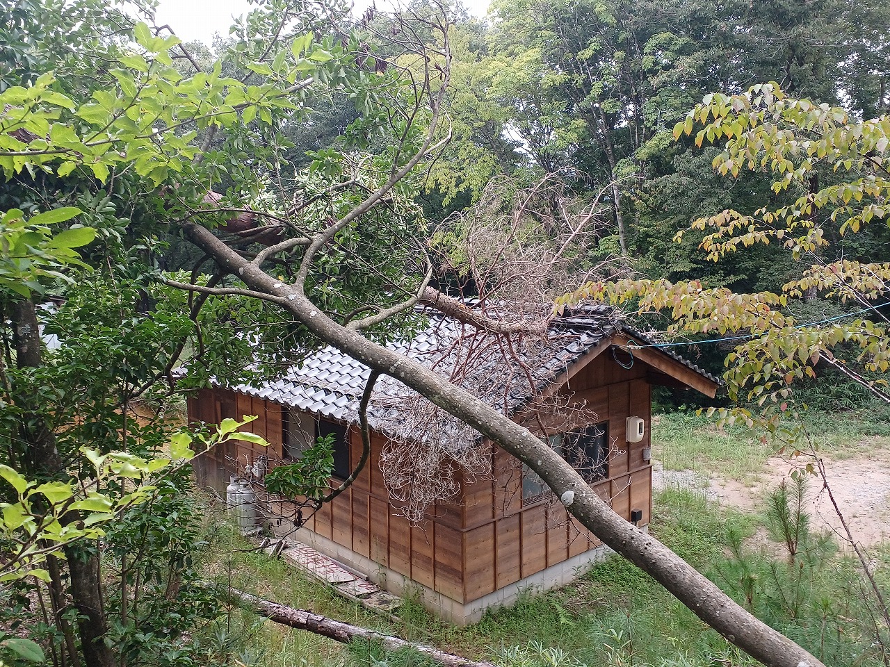 「板橋さとやま学びの森」の作業小屋の屋根に枯れ松が倒れていました。被害は奇跡的に棟瓦1枚破損でしたが、後片付けが大変です。