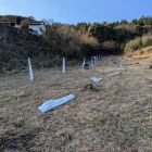 シカが漆の樹皮を食べるのを防ぐカバーを苗木に被せる作業です。